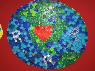 Submitted by efinch on Tue, 2013-04-23 14:11 We collected plastic bottle caps to create a mosaic of the Earth Project number: 53School/Organization/Group: Elizabeth Finch SchoolCity: EdmontonProject type: ArtsRecycling