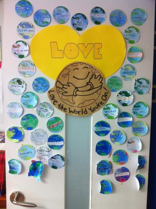 Our first Green Schools project! The theme "Love the World You're On" was put on our classroom door. We discussed and decorated the door with miniature Earths which featured our ideas on how we affect the Earth and how we can help protect it, including:recycling, reusing and conservation. The students were really excited to point out that our Earths were also printed upon reused paper!
