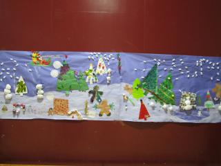 We reused Christmas cards, newspaper, styrofoam pellets, and other materials to decorate our hallways and gym for our Christmas concert.