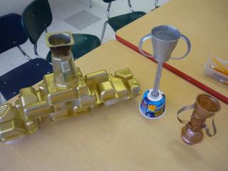 The Green Schools Team is holding a contest to see which classroom produces the least waste in two weeks. They made trophies out of recycled items such as lunchable containers, fruit cups, pudding containers, etc to represent a gold. silver, and bronze trophy. The winning classrooms will be presented with the trophies in two weeks!