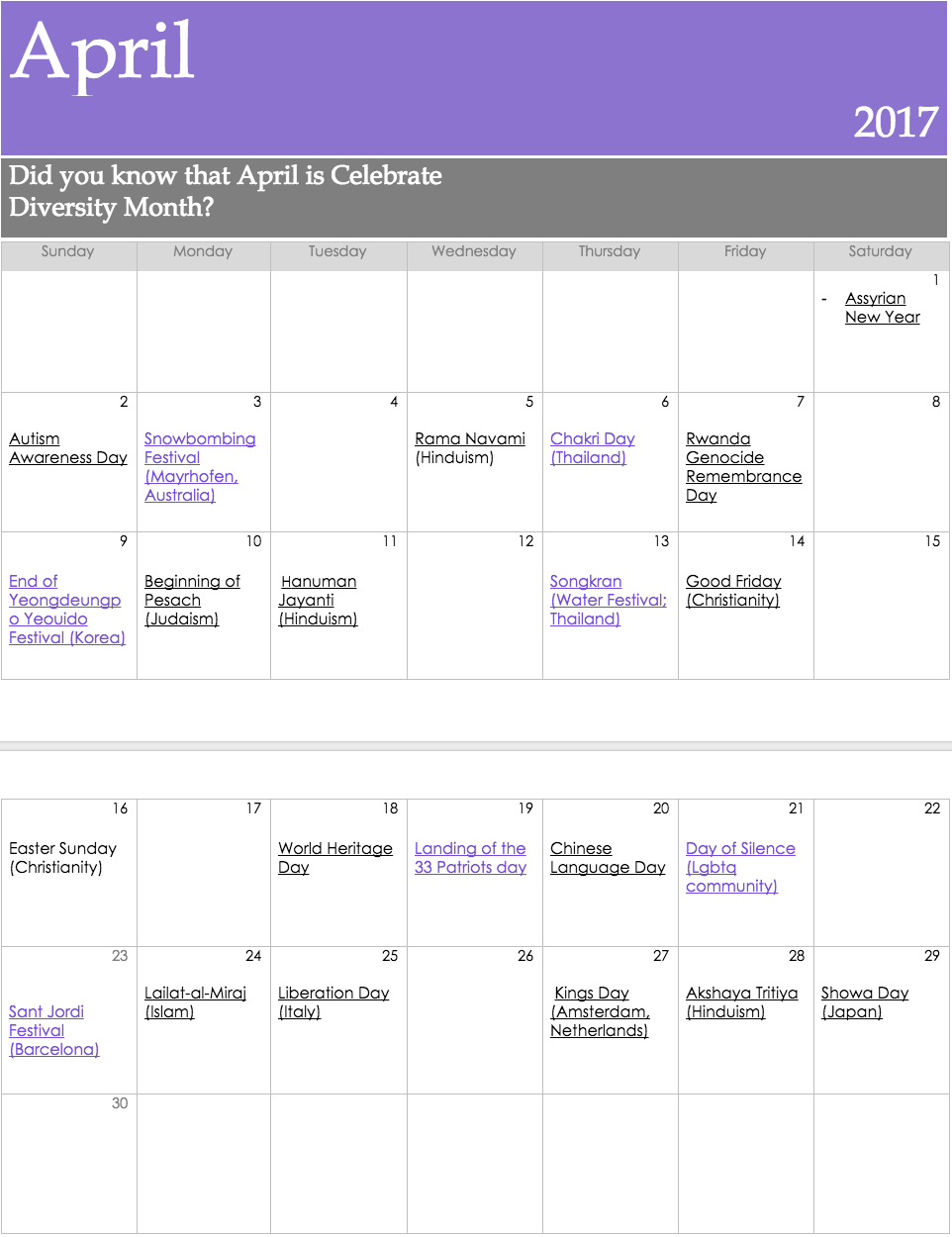 Six students created an online calendar to create awareness about Multicultural events around the world. This was shared on social media with the whole school population of 750 students and teachers. “We are creating a calendar for the months of April, May and June that shows all the religious and cultural events/holidays that occur during that specific month. We hope to raise awareness about the many different cultural and religious celebrations and events that happen each month. We want both students and teachers to understand the diversity of all these cultures and religions.”